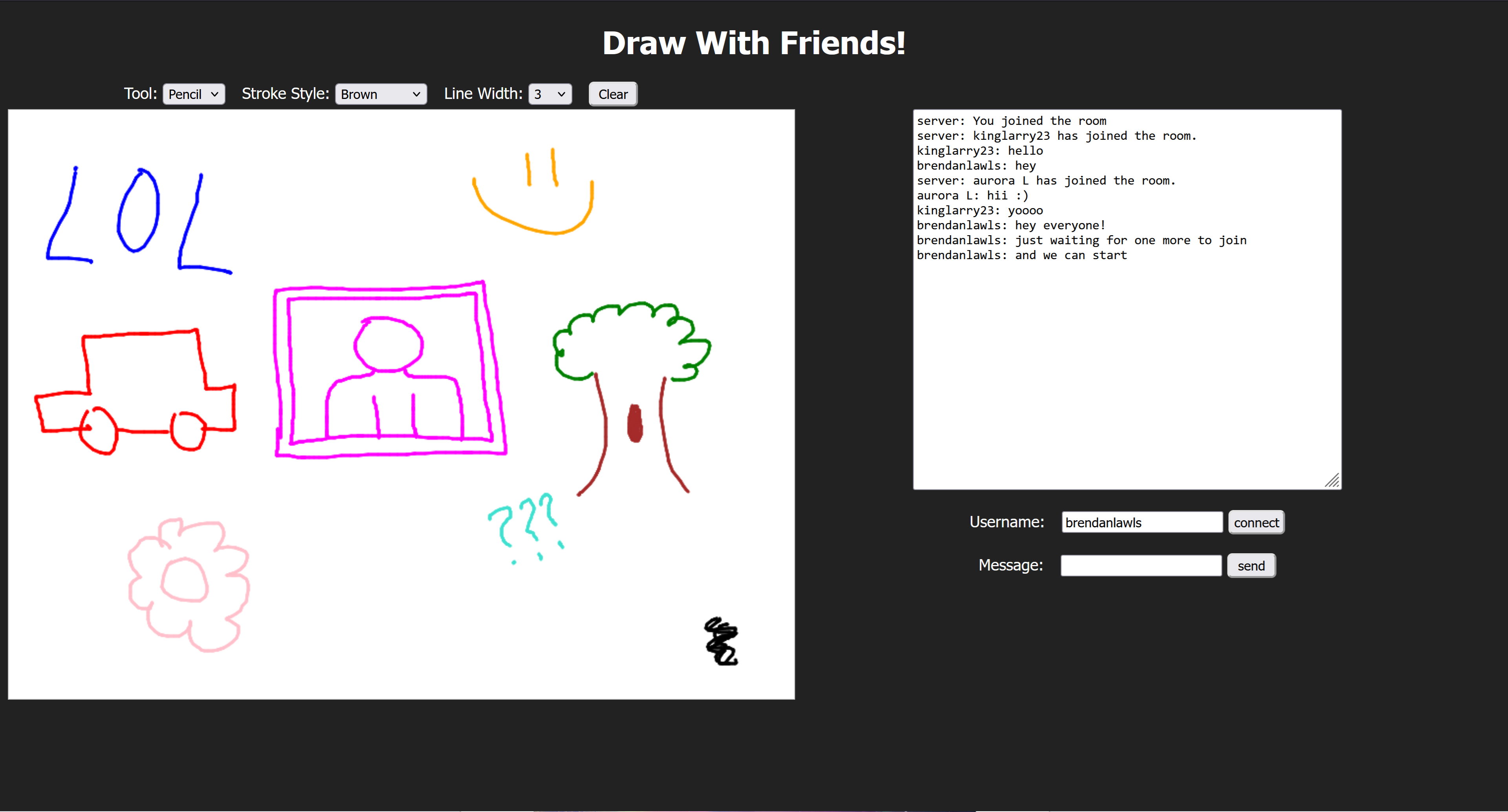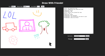 Draw With Friends! is a 4 player pictionary browser game. Each round, 1 player will be declared as the drawer and will be given a word to draw. The other 3 players must guess the word. The player to guess correctly will gain 1 point; the first person to 3 points wins!